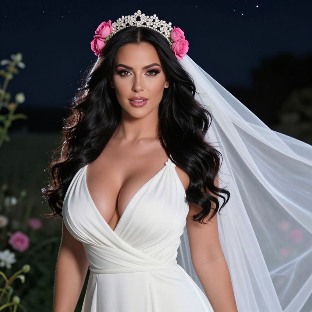 A beautiful woman with long, flowing dark hair, wearing a luxurious white dress with a flowing veil and a delicate headpiece adorned with vibrant pink roses, exuding timeless elegance and charm. Her seductive allure is evident in her confident gaze and graceful posture, with a captivating presence that draws the viewer in. She has a sophisticated beauty, with full, lush curves and big tits, radiating sexy sophistication as she stands in a moonlit garden under a starry sky, the soft light enhancing her glowing skin and mesmerizing aura.