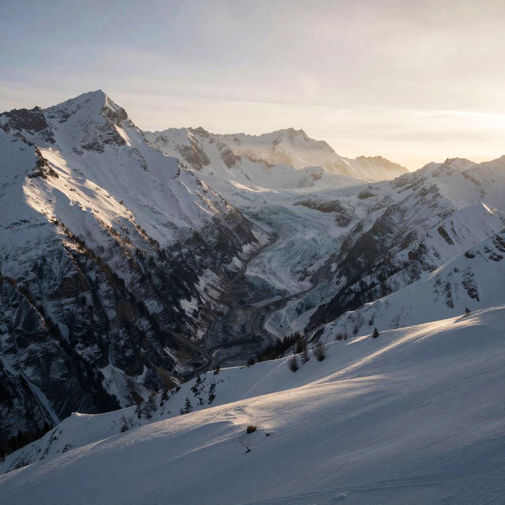 Snow-Capped Peaks, pristine snowbanks, calm and cloudless, late morning, Photojournalistic clarity, vibrant colors