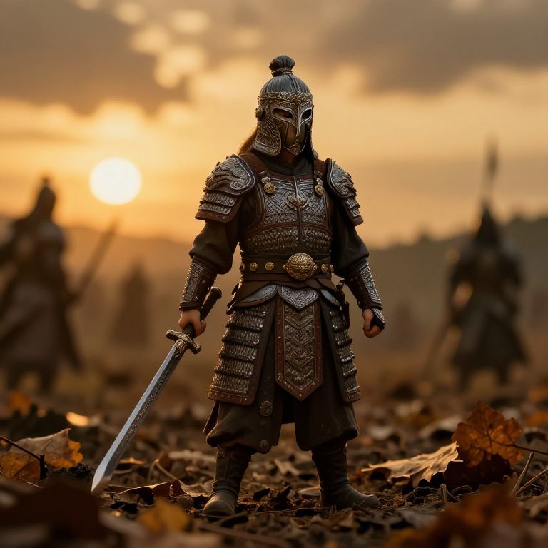4'5 miniature ancient warrior in ornate armor standing on a battlefield strewn with fallen leaves, dramatic lighting with a golden sunset, detailed textures on armor and weapons, epic fantasy style, atmospheric and emotional