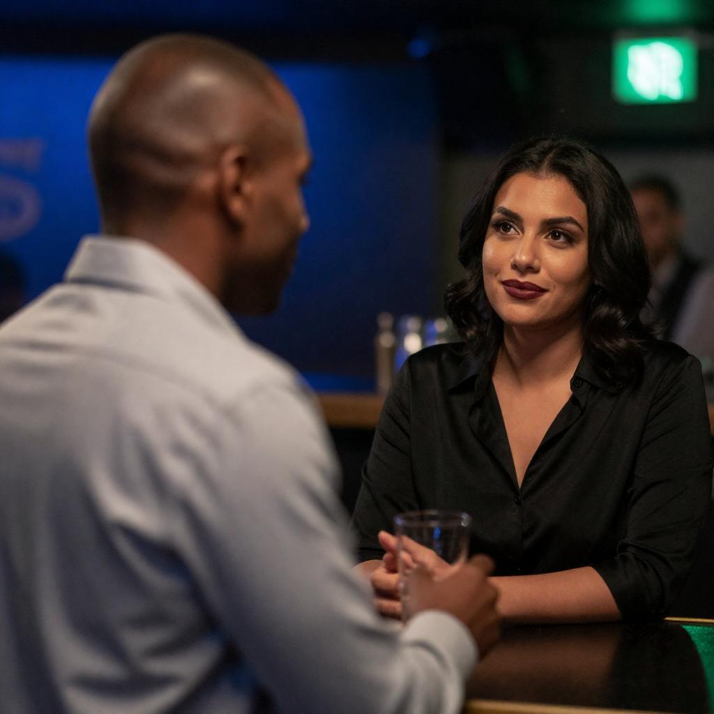 Photograph of a bar scene with a bald, dark-skinned man in a light gray suit holding a glass, facing a dark-haired woman with olive skin and dark lipstick, wearing a black blouse. She looks at him with a slight smile. The background features blue and green neon lights and blurred bar elements.
