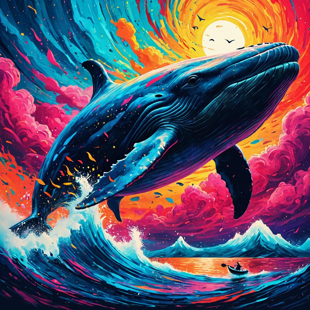 Surrealistic 8K illustration featuring a whale swimming in a sky of paint strokes, rendered with vibrant and intense colors. The scene includes dynamic brush textures and vibrant blending and a dreamlike atmosphere with surreal, high-quality ultra-detailed lighting.