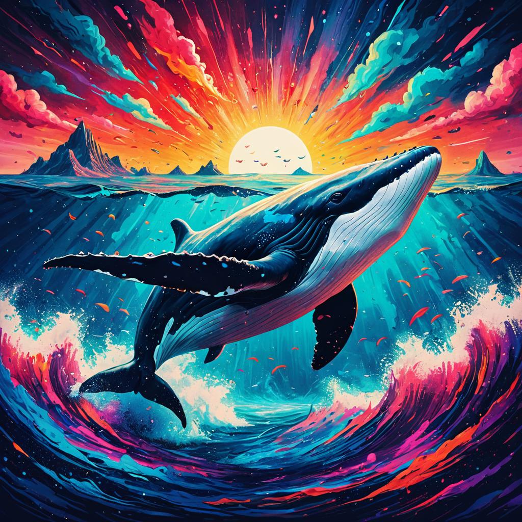 A surrealistic digital illustration of a large whale swimming through a sky composed of dynamic paint strokes with intense and vibrant colors. The scene features expressive brush textures, ultra-detailed lighting effects, and a dreamlike atmosphere with a radiant sun and colorful clouds surrounding the whale.