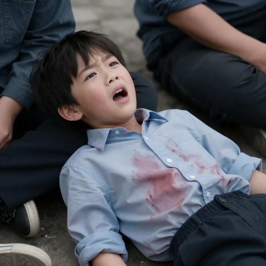Distressed young man with dirty face, open mouth, wearing a stained shirt and jacket, standing in a tiled urban plaza. Background: several people walking, glass railings, commercial buildings, yellow tactile paving. Sunlight casting shadows.