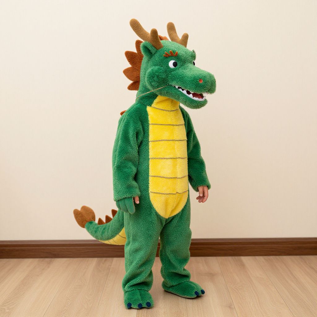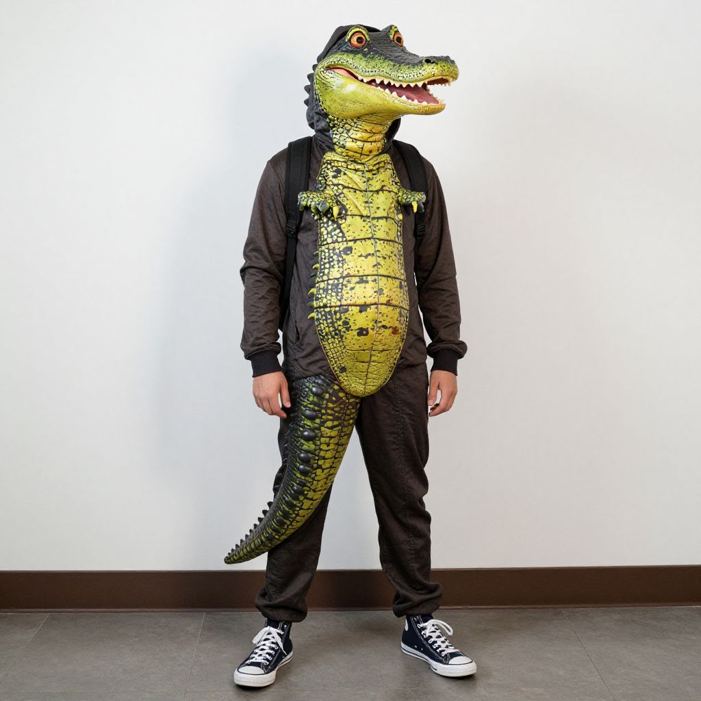 Photograph of a person wearing a detailed, yellow and green alligator costume with black jacket, pants, and black sneakers against a white wall.
