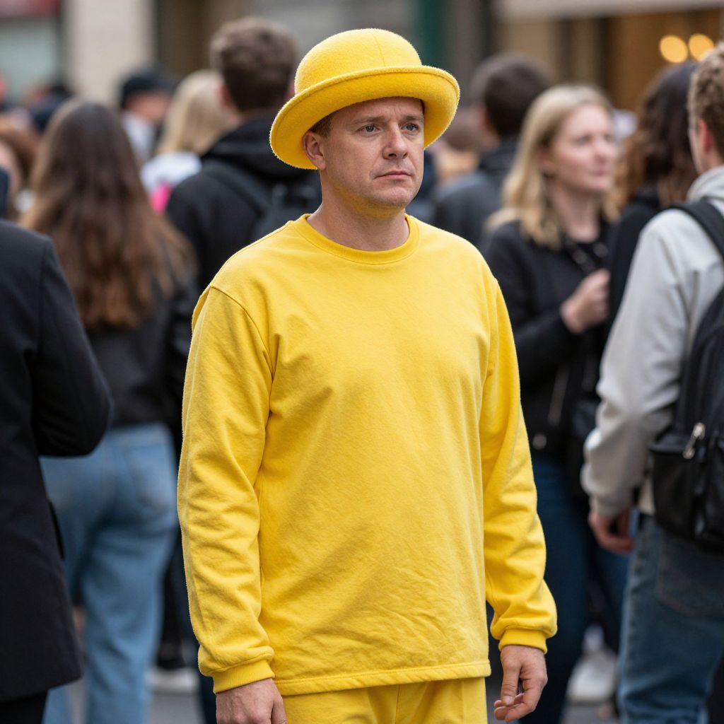 "Yellow Wiggle, man in yellow costume standing in a crowded area"