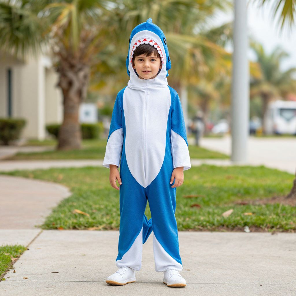 Sharkboy Costume Adult, child in shark costume standing on sidewalk with palm trees in background