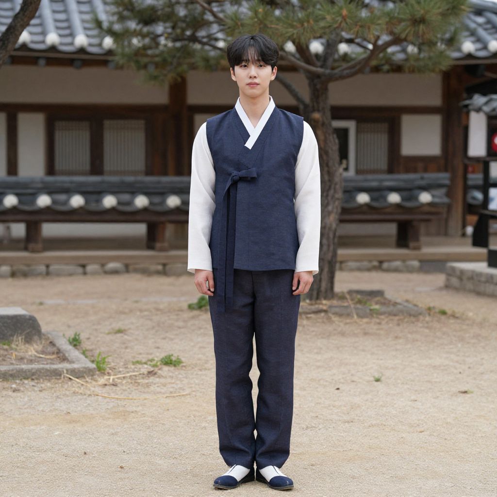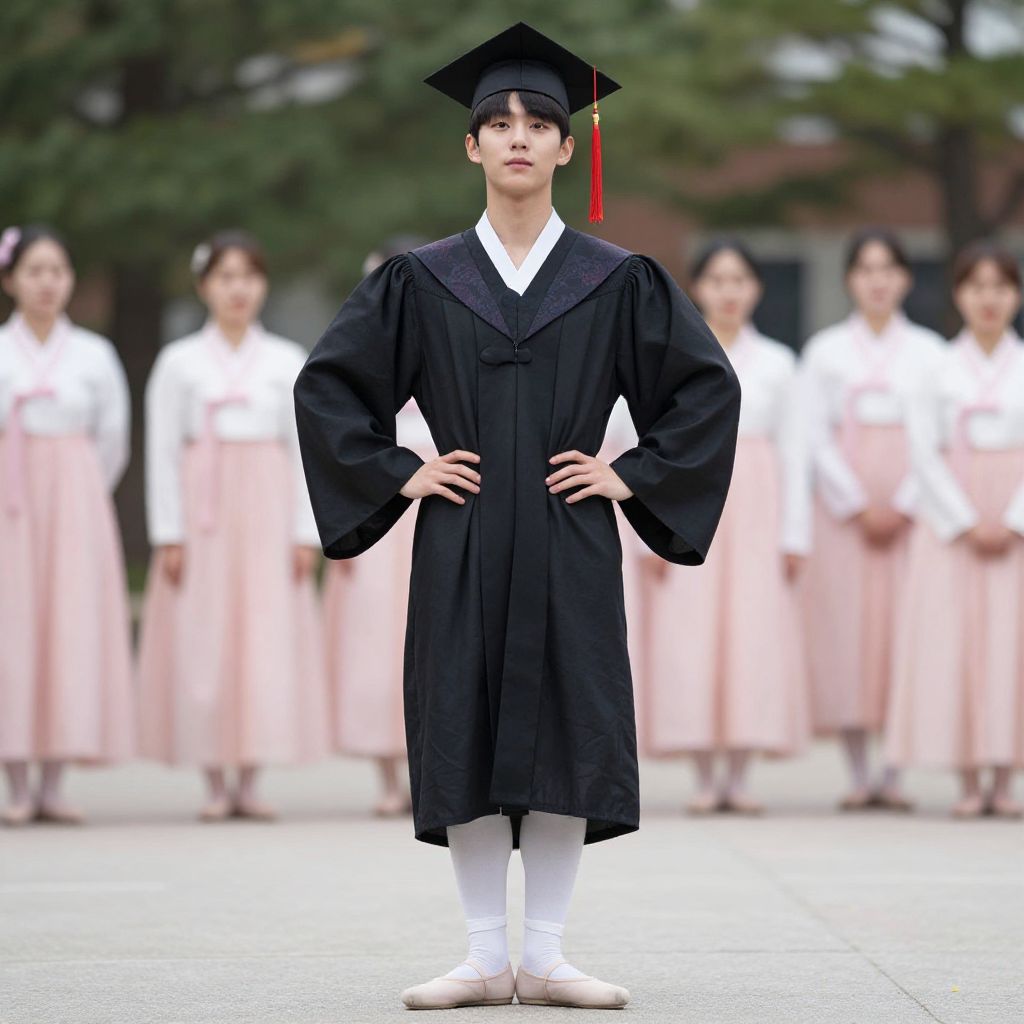 "graduation ball ballet, solo, hat, black headwear, blurry background, full body, long sleeves, standing, male focus, hands on own hips, looking at viewer, 1boy, wide sleeves, dress, korean clothes, blurry, closed mouth, crossdressing Realistic photo of casual sexy person with pretty face"
