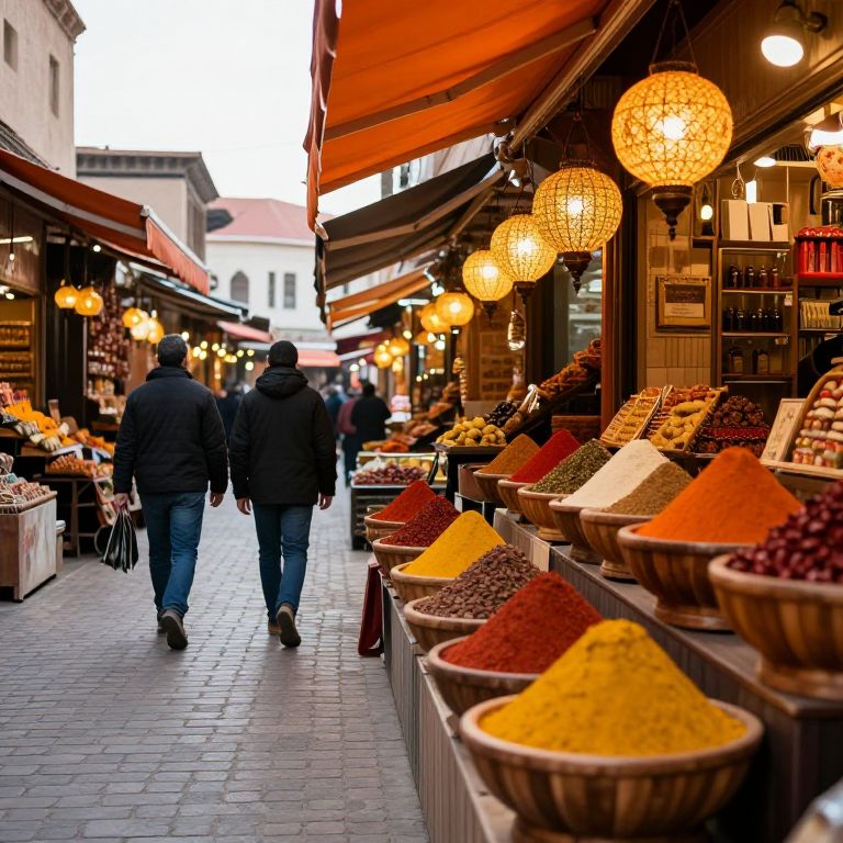 Vibrant umbrellas float above a bustling street lined with colorful awnings, where people stroll and sit, creating a lively urban scene.