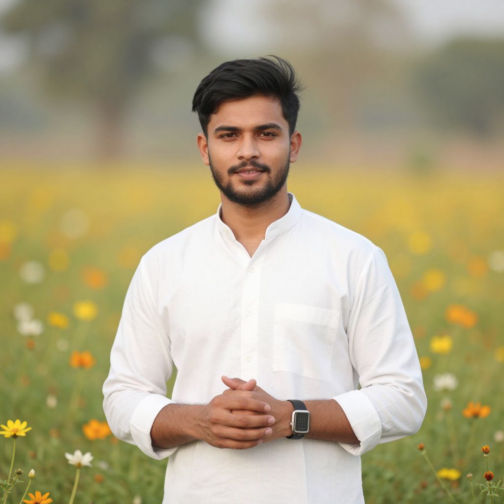 Photograph of a young South Asian man with medium brown skin, black hair, and a trimmed beard, standing in a vibrant field of yellow and orange flowers. He wears a crisp white long-sleeve shirt, with his hands clasped in front of his waist. A black wristwatch is visible on his left wrist. The background is softly blurred, featuring green grass and trees, creating a serene, natural setting. His expression is calm and slightly smiling. The lighting is natural, highlighting his features and the colorful field.