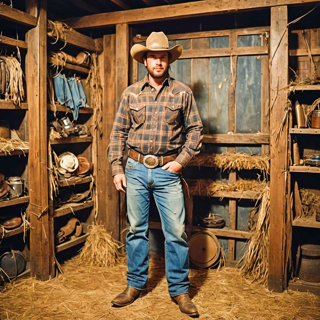 Stocky man wearing a sepia cowboy hat, blue denim vest, plaid shirt, ripped denim jeans, and a leather belt with a decorative buckle stands inside a barn during a lively barn dance party. The wooden barn interior is filled with people dressed in western attire, creating a rustic and festive atmosphere.