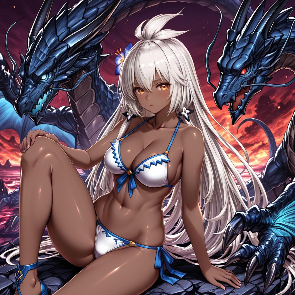 Zooey (granblue fantasy), granblue fantasy, 1girl, dark-skinned female, red eyes, hair between eyes, white hair, very long hair, long hair, ahoge, hair flower, medium breasts, cleavage, navel, collarbone, white bikini, bare shoulders, dragon, by artist ishimiso (ishimura), dark_illustrious