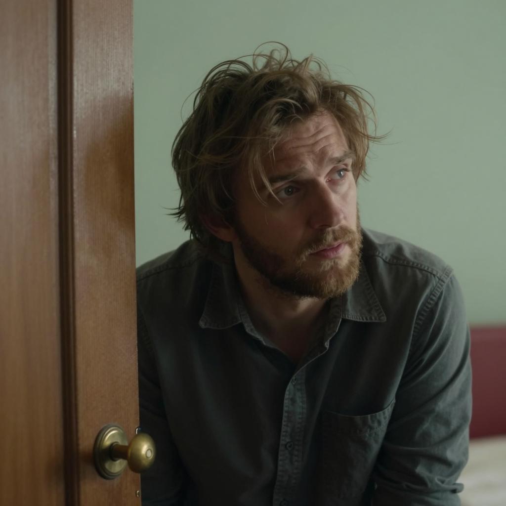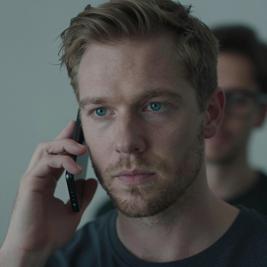 Motion-blurred photograph of a man with short brown hair, focused expression, and light-colored shirt in the foreground. A blurred car with colorful lights in the background. The man's face is sharp, while the car and lights are heavily blurred. The man is slightly to the right, car to the left. Two people in the car, one with a raised arm, partially visible.