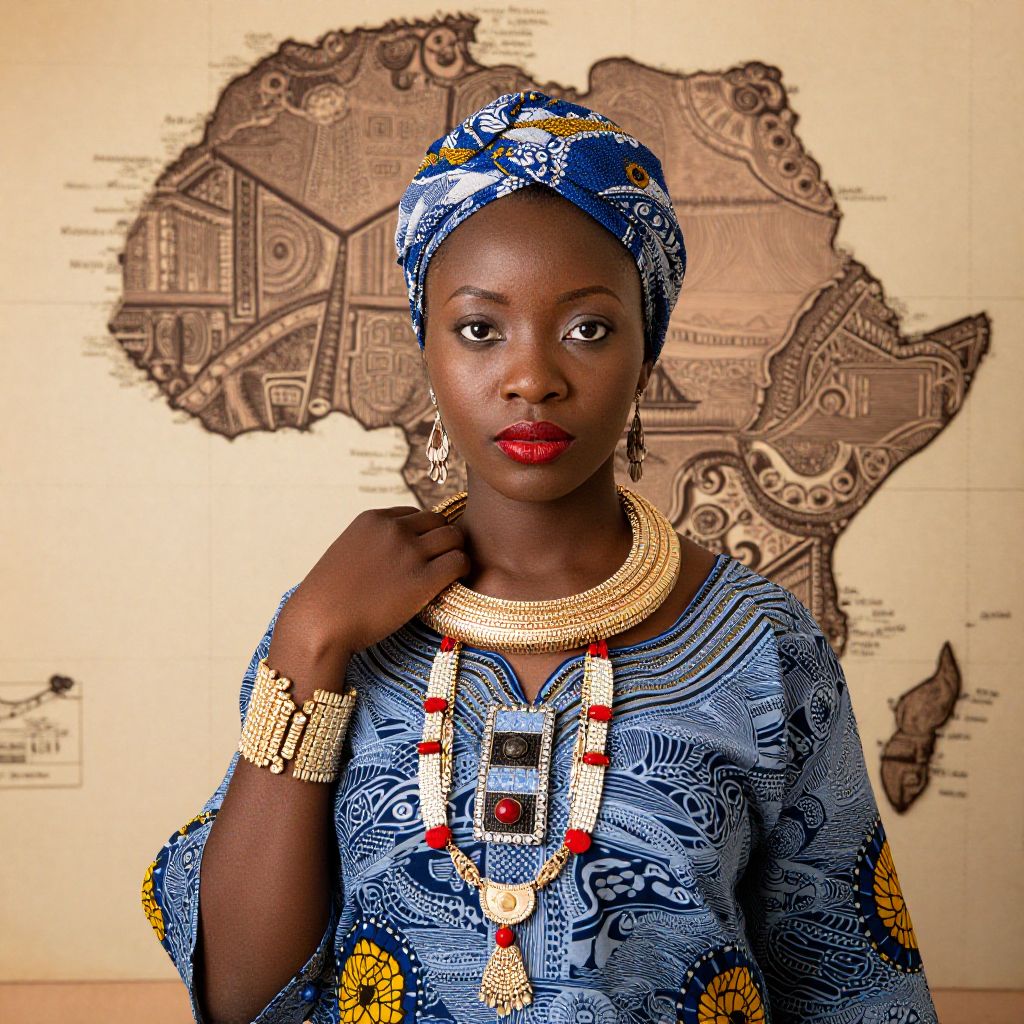 A woman adorned with traditional African jewelry and headwrap stands against a backdrop of intricately detailed African map.