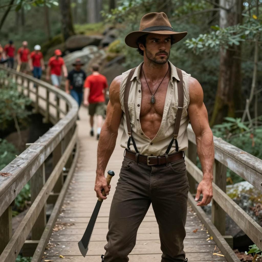 A muscular man with a brown hat, open shirt, and suspenders holds a machete in his right hand. He stands on a wooden bridge in a forest, looking ahead with a determined expression. In the background, a group of red-shirted people walks up a rocky path. Dense green trees surround the bridge.