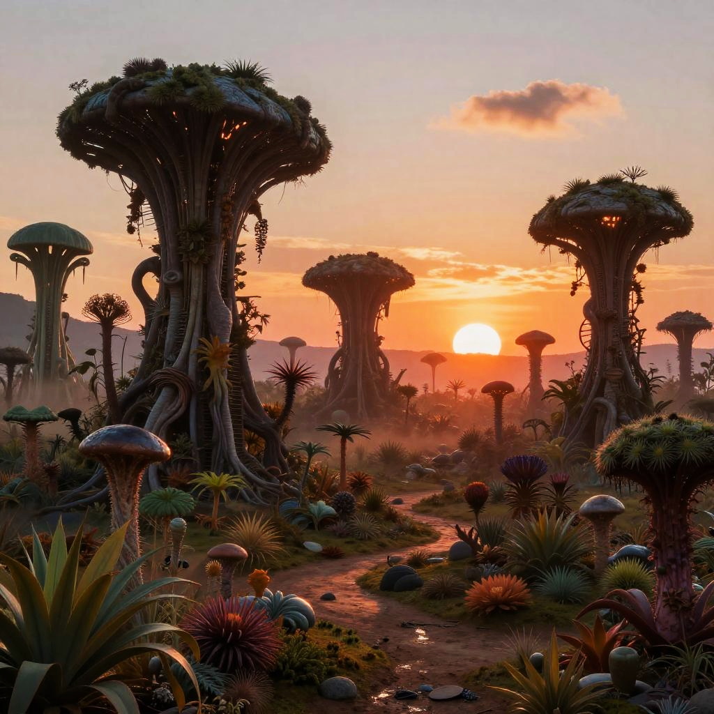 Realistic:zomvb_amzka= depiction of a surreal alien landscape filled with strange plants and creatures under a vibrant sunset, highly detailed textures and natural lighting, ultra-realistic style, cinematic atmosphere, emphasizing otherworldly realism