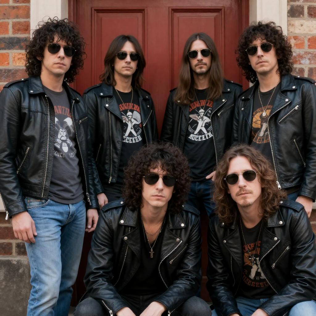 Group photograph of nine rock musicians on stage. Front woman kneels, playing guitar, wearing a black crop top and jeans. Central man in fur coat, cowboy hat, muscular, shirtless. Left and right men with long hair, sunglasses. Back row: man with beard, blonde woman with arm raised, woman in red jacket. Background: bright lights, stage lights, misty atmosphere. Various rock outfits, intense expressions. Guitarist in front, standing behind. Stage, rock band, group formation.