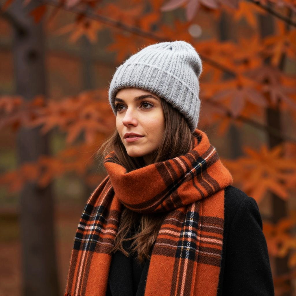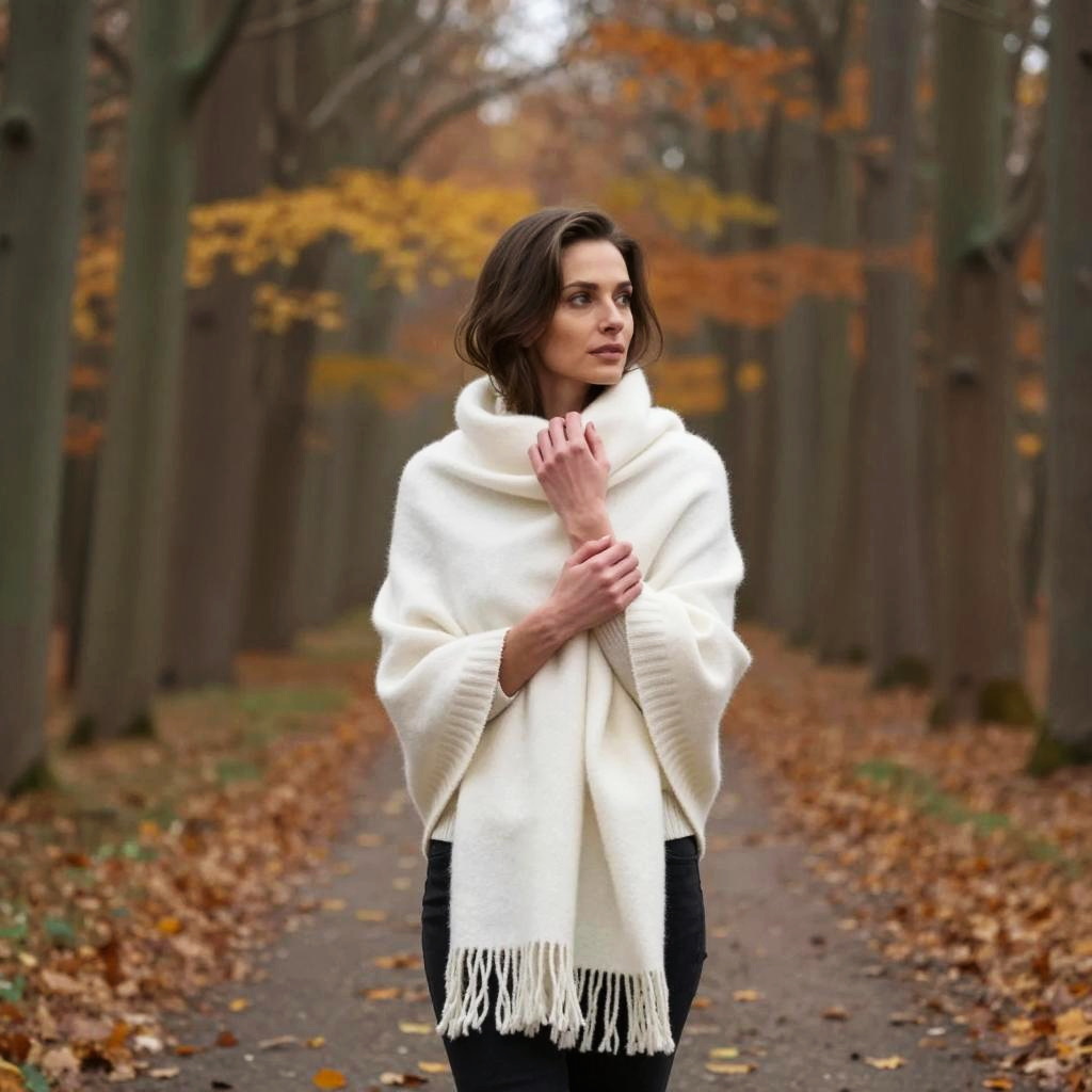 A serene autumn scene featuring a woman wrapped in a cozy white shawl, standing gracefully on a path surrounded by a forest of tall trees. The warm tones of fallen leaves and the soft-focus background enhance the tranquil atmosphere of the image, making it perfect for evoking feelings of peace and comfort.