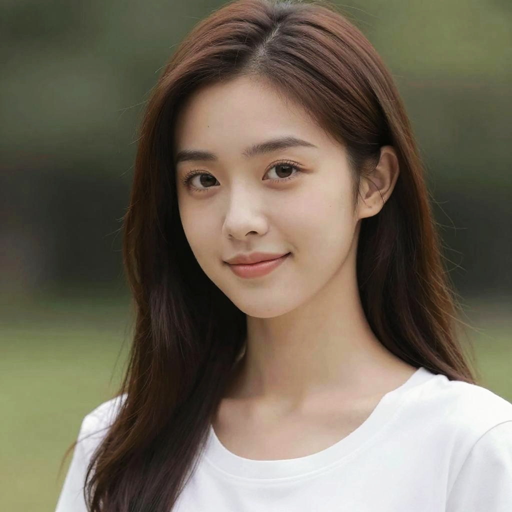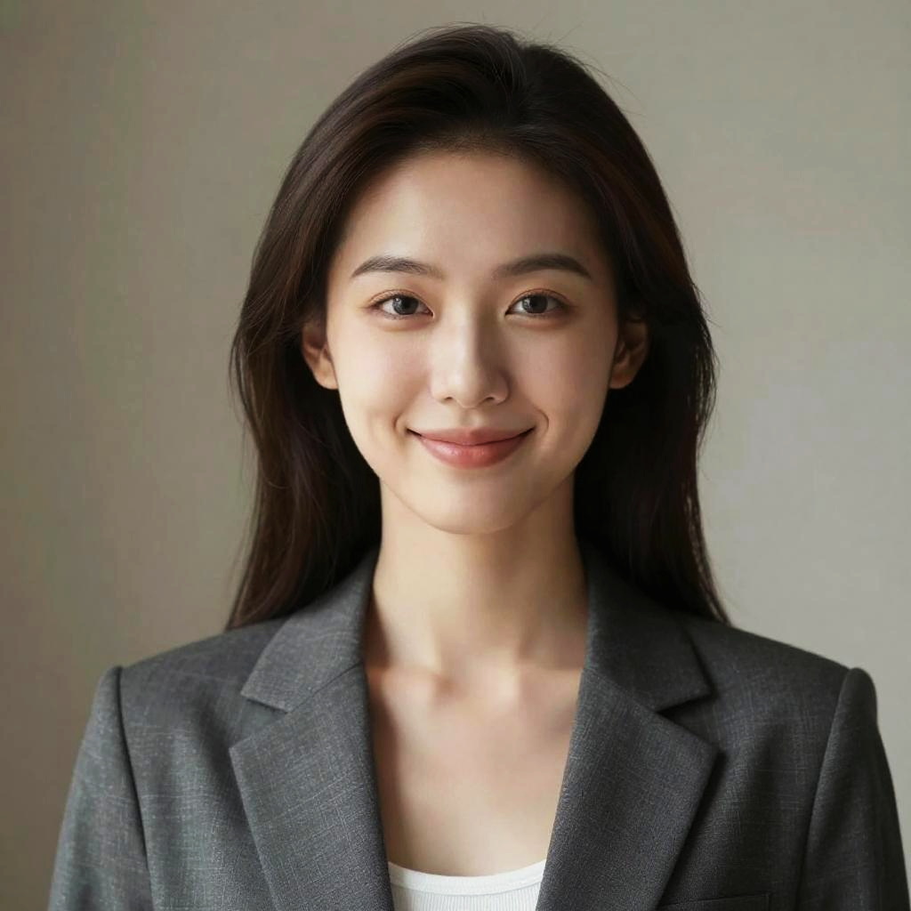 Photograph of an Asian woman with a fair complexion and straight, shoulder-length black hair. She is wearing an off-the-shoulder, light gray knit sweater that reveals her collarbones. Her expression is neutral, with a slight smile. The background is blurred, showing an urban street with trees, parked cars, and indistinct figures. The lighting is natural, and the overall color palette is muted, with soft gray and green tones. Her makeup is minimal, enhancing her natural features. The image focuses on her from the waist up, centered in the frame.