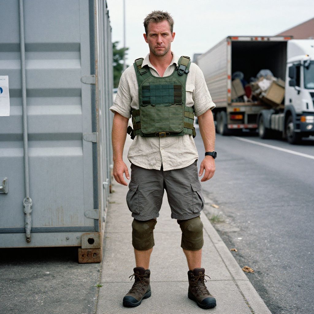 A man, short-sleeve hunting shirt in beige linen, tactical vest in forest green ripstop, cargo shorts in slate gray, waterproof hiking boots in dark brown, tactical knee pads in olive, urban landscape, large metal containers, busy trucks unloading, chromogenic film style, focused expression. Man has masculine face and piercing eyes