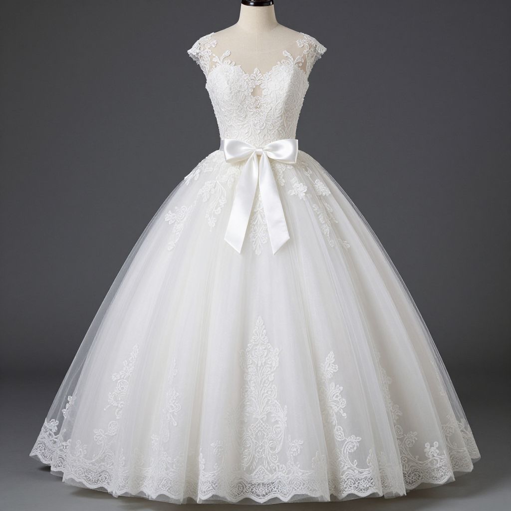 Elegant white lace ball gown featuring a sheer bodice with floral embroidery, a voluminous tulle skirt, and a large satin bow accentuating the waist, showcased on a mannequin for formal occasions such as weddings, Christmas parties, or first communion events.