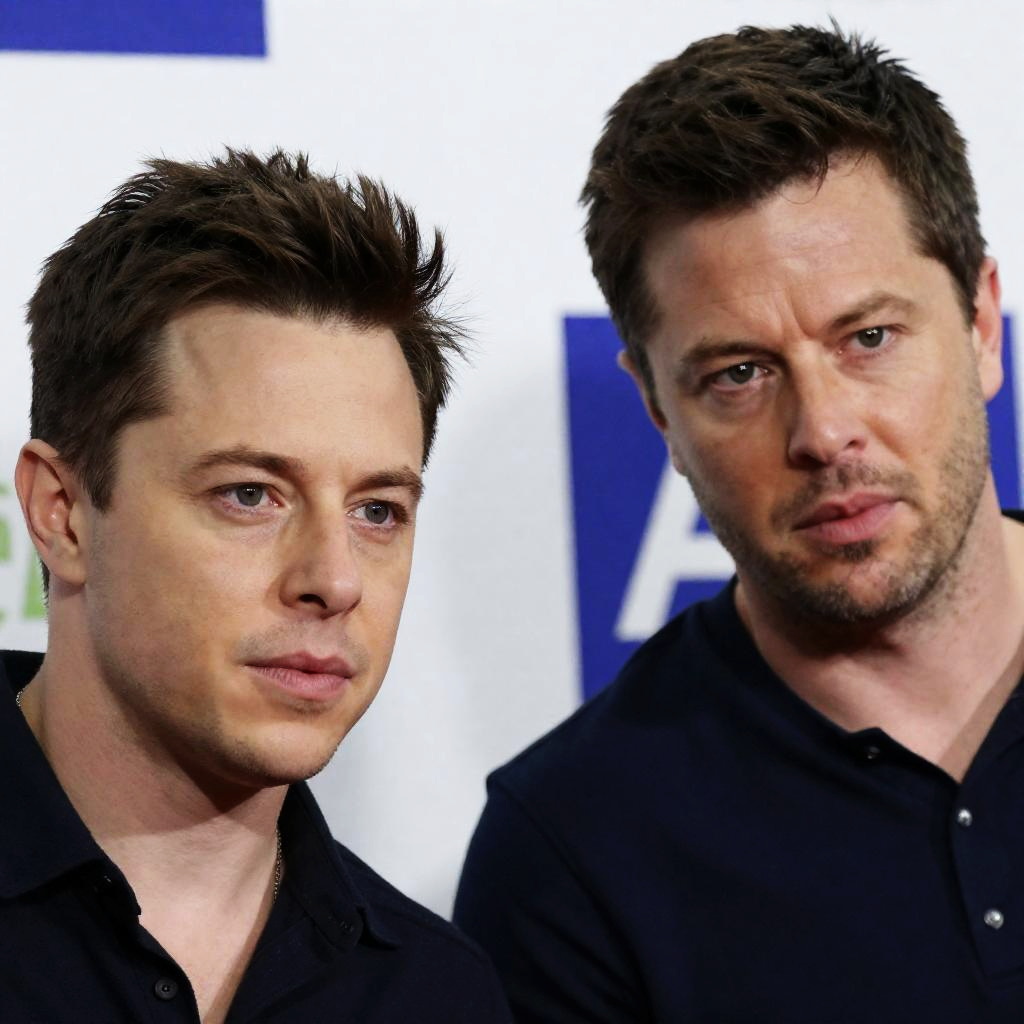 Photograph of two men with intense expressions. Both have short brown hair, the man on the left wears a dark shirt with a necklace, the man on the right wears a dark blue shirt. Background includes blurred white and blue objects.
