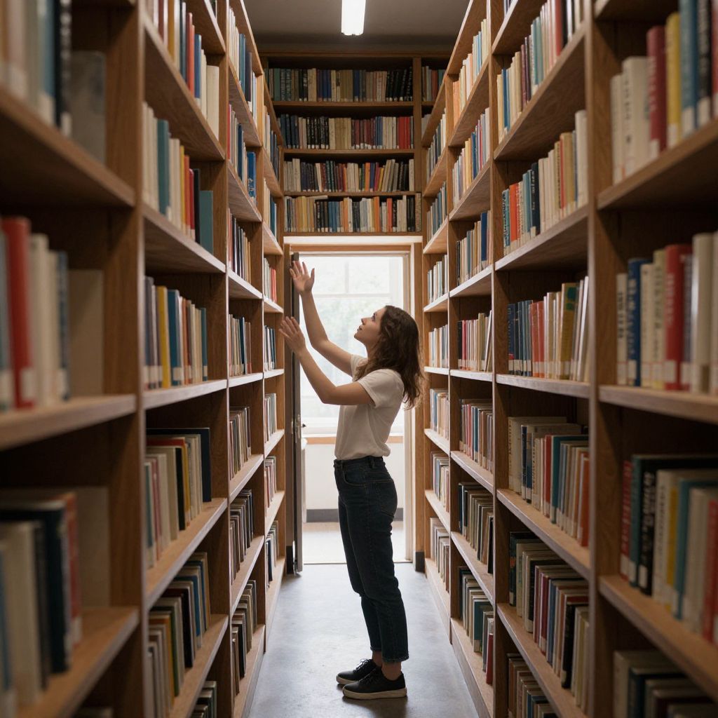 Photograph of a woman with curly brown hair, wearing a white shirt and blue jeans, reaching for books in a narrow, well-lit library aisle