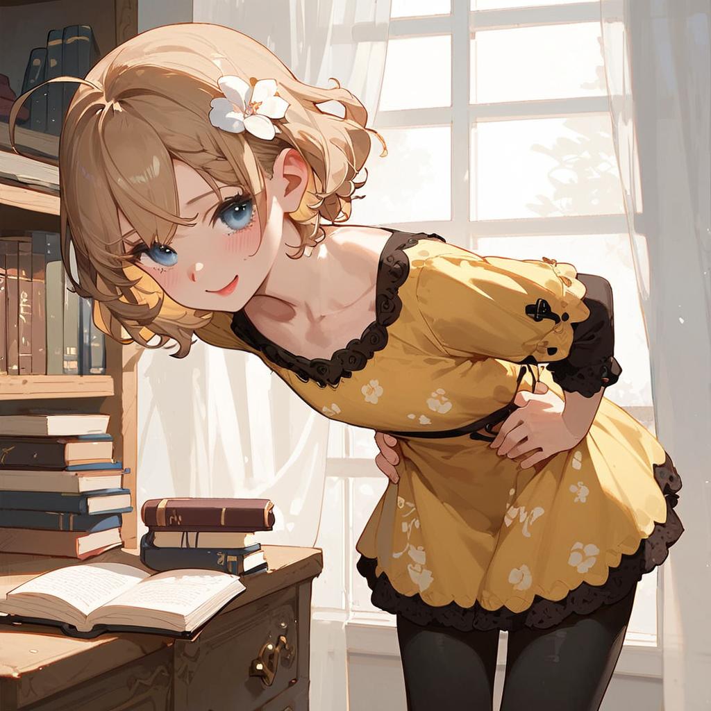 Score_9, score_8_up, score_7_up, source_anime 1girl, suou momoko, casual, leaning forward, white flower, smile, short hair, print dress, light brown hair, brown hair, collarbone, short over long sleeves, yellow shirt, wavy hair, holding, closed mouth, blue eyes, blush, hair flower, v-shaped eyebrows, hair ornament, ahoge, standing, short sleeves, layered sleeves, yellow dress, eyebrows visible through hair, long sleeves, black pants, leggings, hands on hips, pants under dress, indoors, window, curtains, bookshelf, book, floral print, flat chest, solo