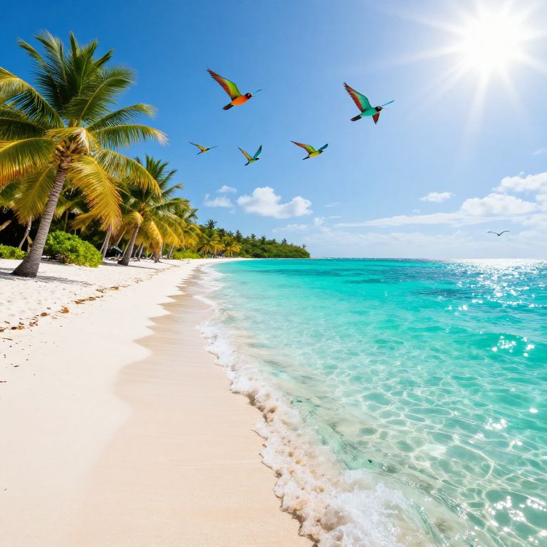 Beautiful tropical beach scene with crystal clear turquoise waters, white sandy shores lined with palm trees, colorful exotic birds flying above, bright sunshine casting sparkling reflections on the ocean.