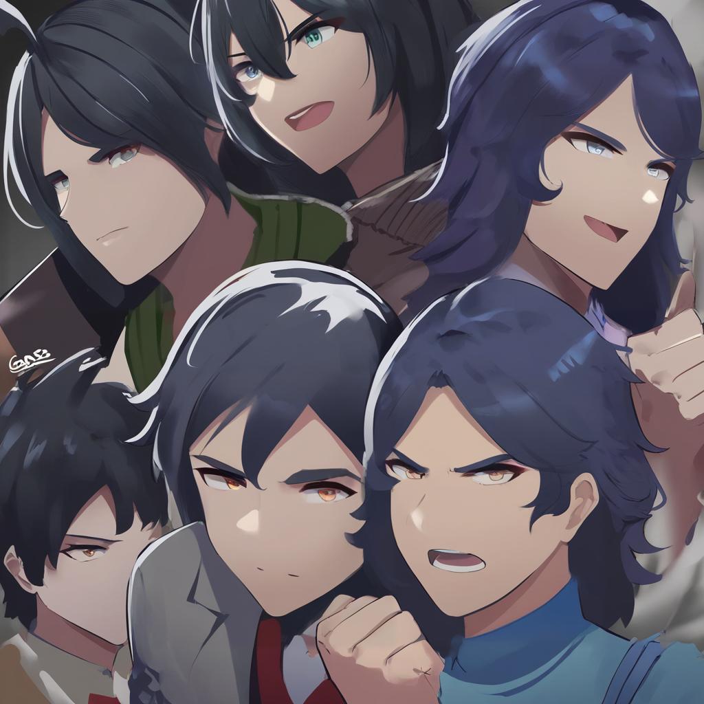Digital anime-style illustration featuring a group of seven young male characters with dark hair in various shades of black and blue. The characters display a range of expressions including confident, determined, and serious. The artwork highlights detailed facial features and hairstyles, with clothing styles ranging from casual to formal. The characters are closely positioned, suggesting a team or group interaction.