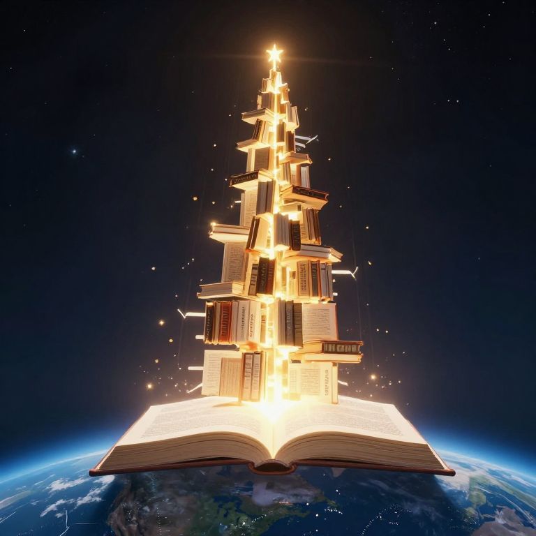 Suspended between earth and sky, a luminous tower of knowledge ascends like a beacon of infinite wisdom, its pages crackling with stories that ignite with each heartbeat, casting a warm glow that dances with the whispers of curiosity and wonder.