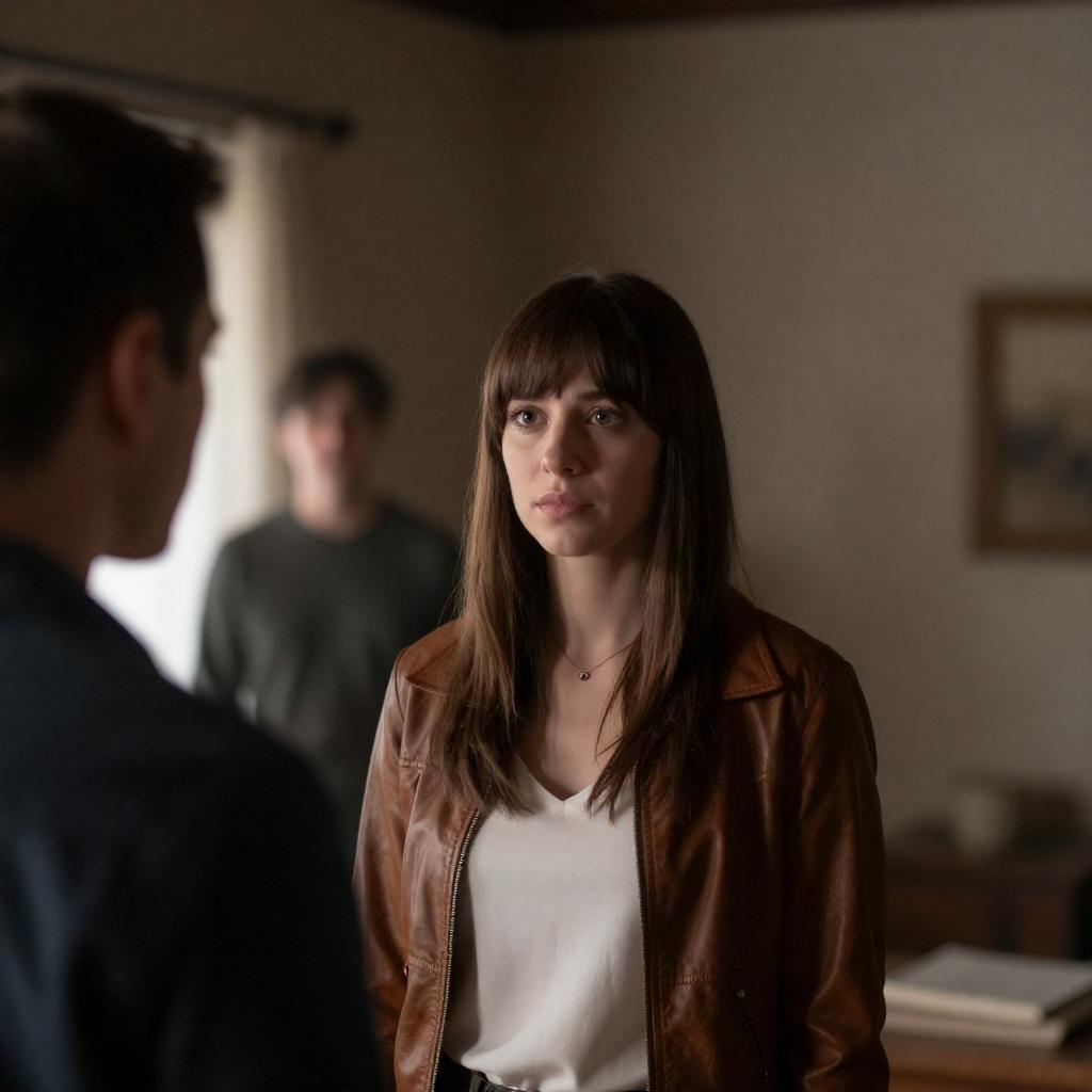 Photograph of a man and woman standing side by side in a dimly lit, rustic room. The man, with shoulder-length brown hair, wears a brown shirt over a dark t-shirt. The woman, with straight blonde hair and bangs, wears a black leather jacket over a white top. The background features wooden walls and a yellow light fixture.