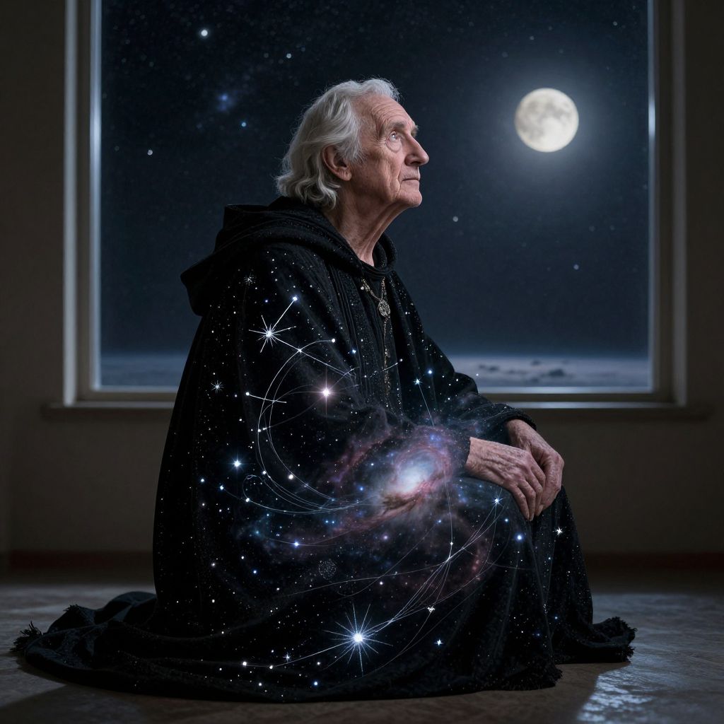 Photograph of an elderly white man with white hair, sitting in profile on the floor, gazing at a full moon visible through a window. He wears a black hooded cloak adorned with a starry night pattern, including glowing stars and constellation lines. His hands are clasped in his lap. The background is dark, highlighting the moon's brightness and the starry cloak. The floor is wooden, adding a textured contrast to the smooth, celestial fabric. The overall mood is mystical and contemplative, blending human and cosmic elements.