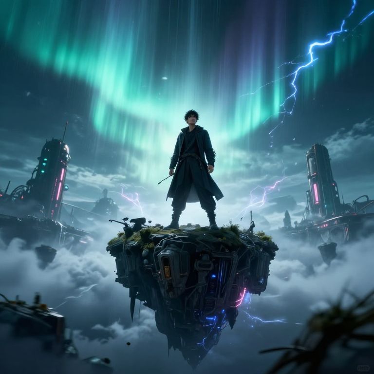 Kaisen Chuui standing atop a floating fortress in a stormy sky, surrounded by electric auroras and massive energy constructs, dramatic lighting, surreal atmosphere, sci-fi aesthetic, epic scale, motion blur, cinematic depth, sharp focus on expression.