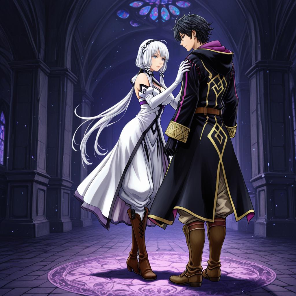 Digital anime-style artwork featuring a man and a woman standing close inside a gothic cathedral. The male character has black hair, purple eyes, and wears a long black coat with gold patterns, beige pants tucked into brown knee boots, and black gloves. The female character has long white hair, light blue eyes, and wears a white dress with detached long sleeves, brown knee boots, and gloves. They stand on a glowing purple magical circle under an arched stained glass window in a dark, mystical interior.