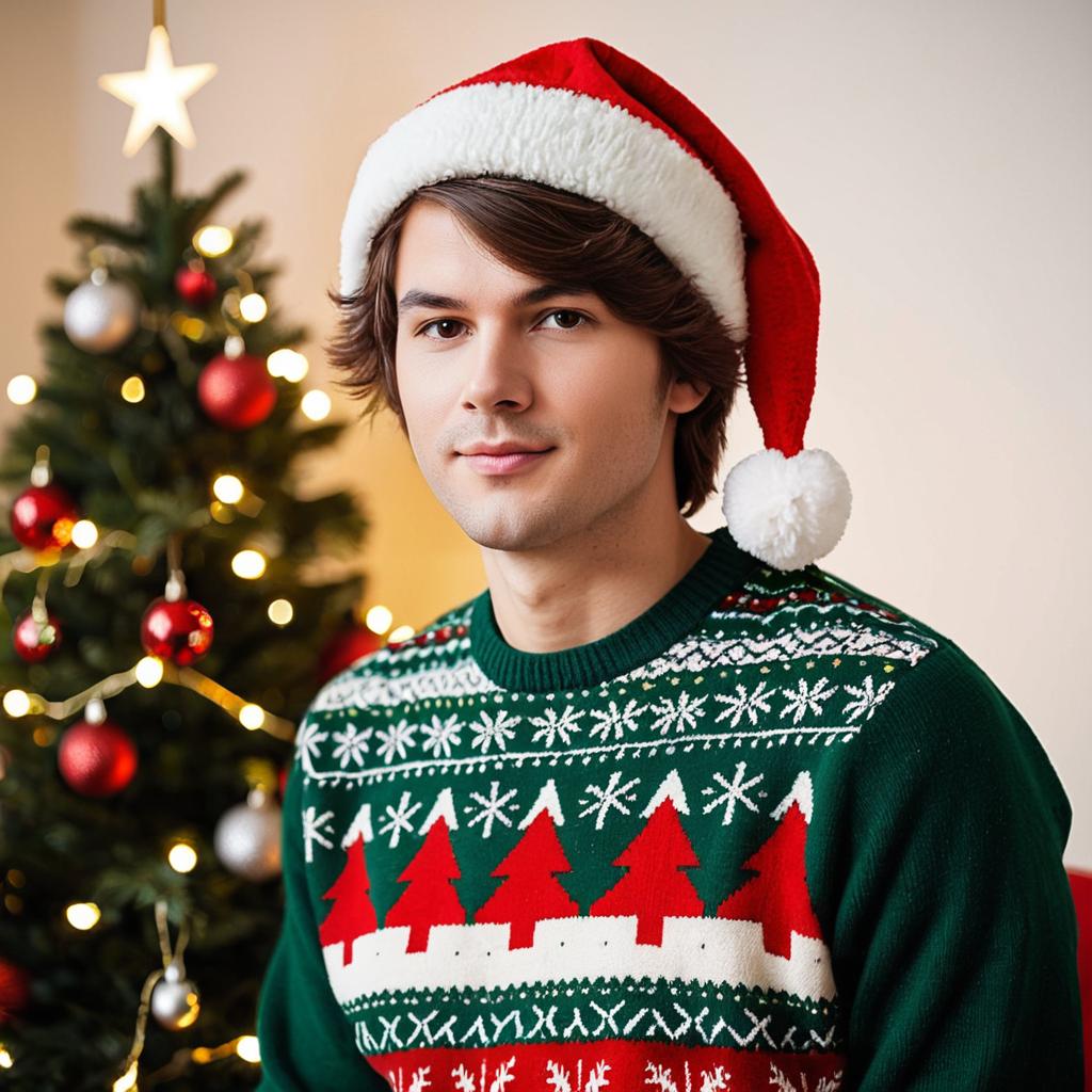 Emo christmas jumper, photorealistic, young man, brown hair, wearing red and green Christmas sweater with festive patterns, red pom-pom hat, neutral expression, background Christmas tree with ornaments, blurred warm lights, indoor setting, casual style, medium shot, realistic ures, holiday theme, model looking at camera, slight shadow on face, modern Christmas decor
