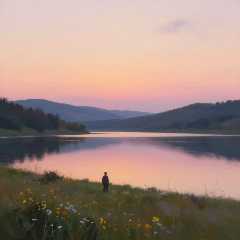Eiree, a serene lakeside scene at twilight, calm waters reflecting a pastel sunset sky, surrounded by rolling hills and wildflowers, a solitary figure gazing across the horizon, impressionist painting style with soft brush strokes and warm colors.