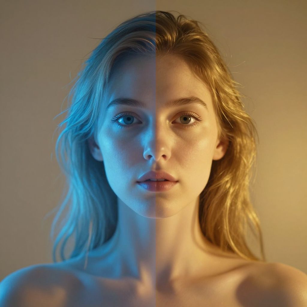 This is a digital photograph of a young Caucasian woman with fair skin and light brown, wavy hair. She is depicted from the shoulders up, with her shoulders bare. The image is split vertically down the center, with the left half bathed in blue light and the right half in warm yellow light. Her expression is neutral, with slightly parted lips and direct eye contact with the camera. The background is a soft, gradient beige. The lighting creates a striking contrast, highlighting her facial features and hair texture. The image has a modern, artistic style, emphasizing light and shadow.