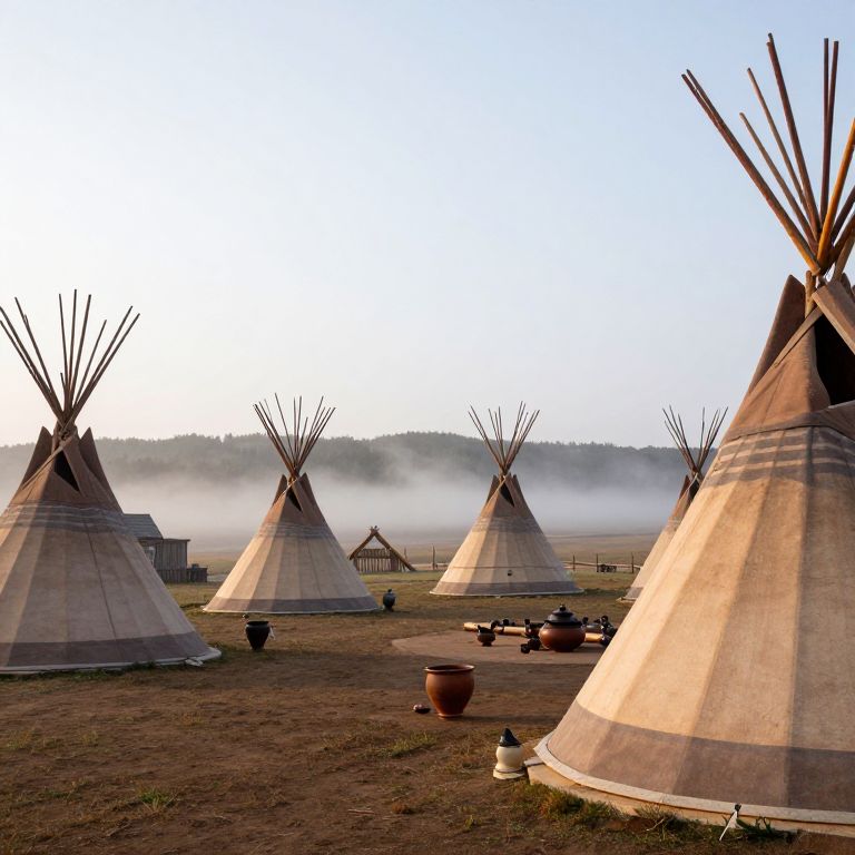 Tipi village scene with multiple tipis arranged in a circle, early morning mist rising from the ground, native artifacts and pottery placed outside, rich earth tones, vibrant wooden poles extending through the canvas, capturing cultural heritage in natural surroundings