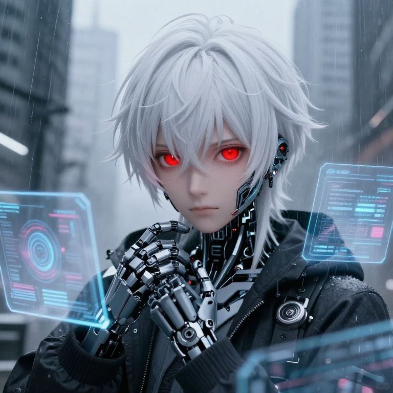 White hair anime boy with red eyes in a cyberpunk environment, intricate cybernetic implants visible on his face and hands, intense red eyes glowing softly, surrounded by holographic interfaces and towering skyscrapers shrouded in rain and mist.