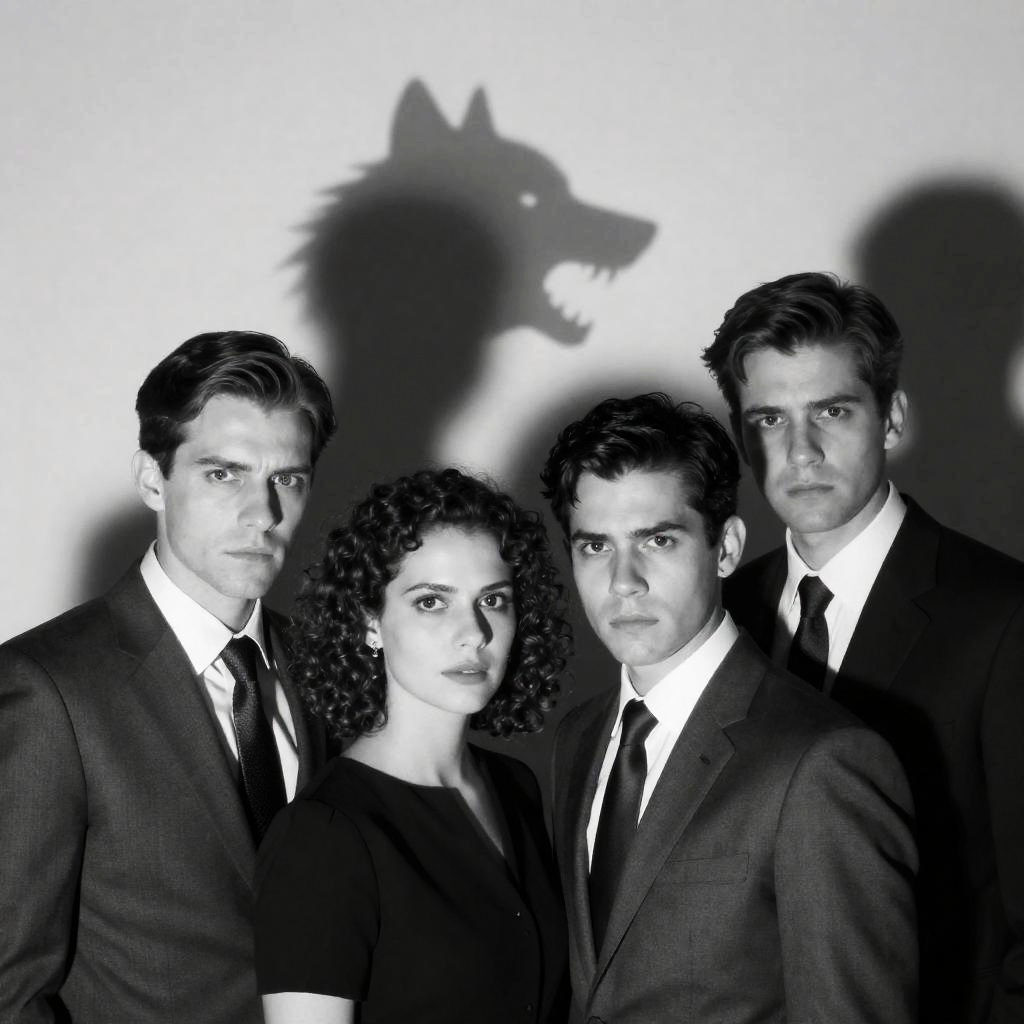 Black and white photograph of four people in suits and dresses, with intense expressions, standing close together. Shadow of a snarling wolf's head on the wall behind them. Three men and one woman, all with neatly combed hair. The woman has curled hair, the men have straight hair. The wolf's shadow is centered above their heads.