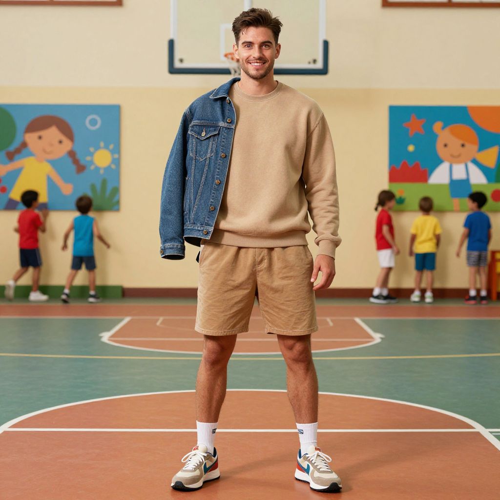 "a man, athletic-fit sweatshirt, relaxed-fit shorts, retro running shoes, denim jacket, earthy tones with bold accents, basketball courts, cheerful kids' art displays, cinecolor, confident smileMan has masculine face and piercing eyes"