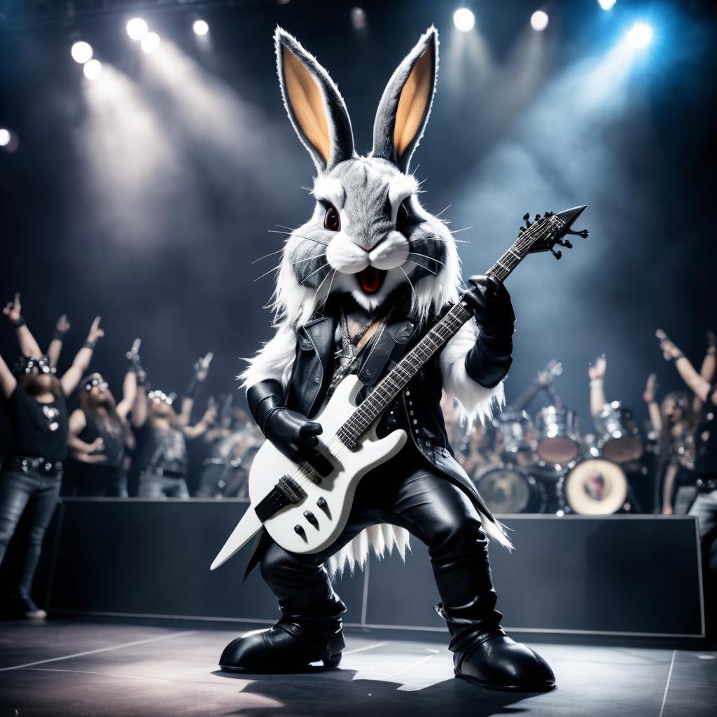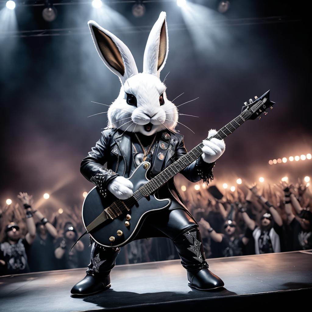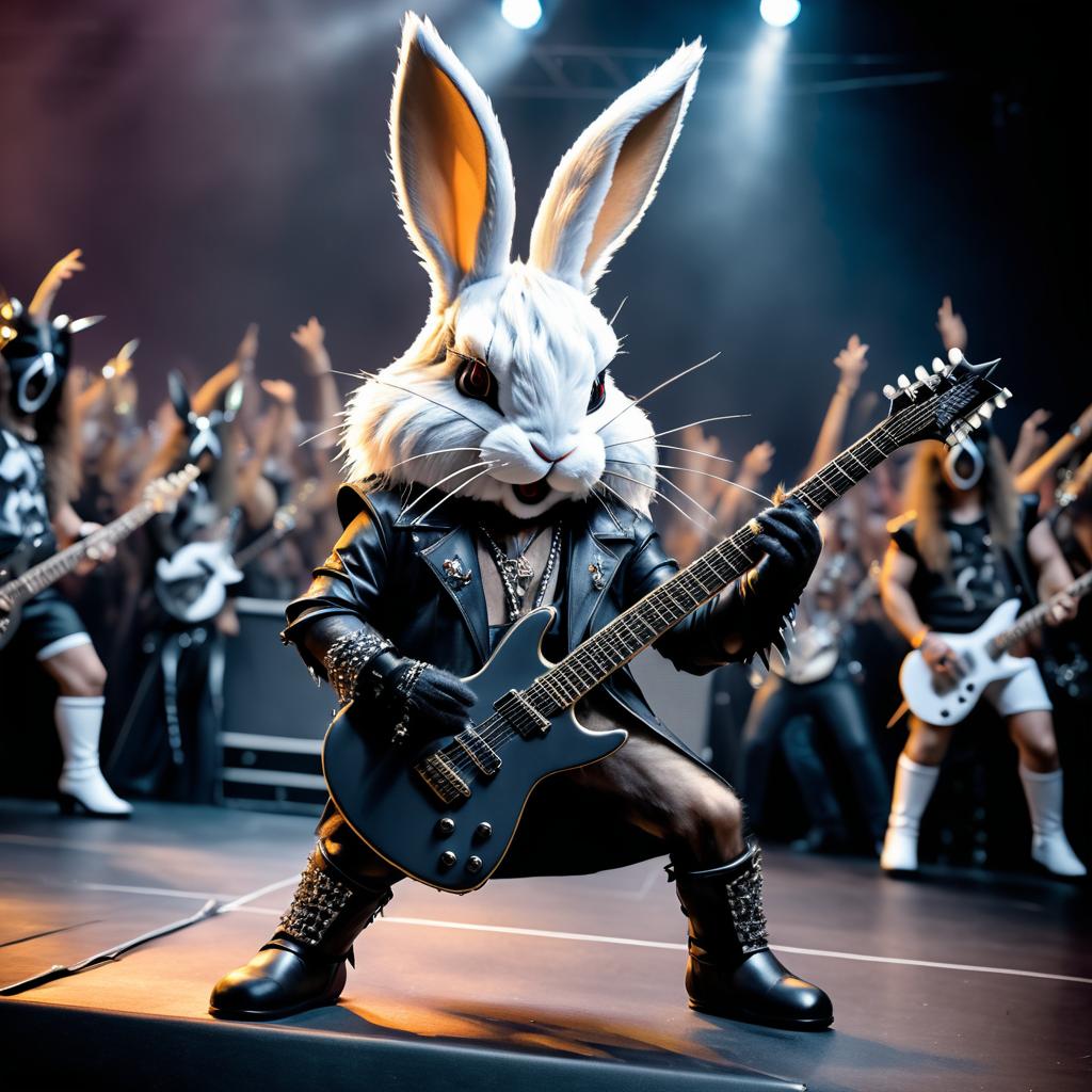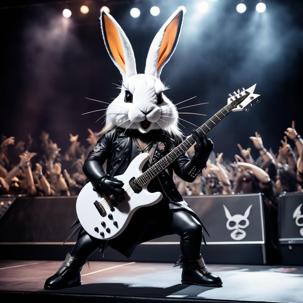 Anthropomorphic rabbit dressed as a heavy metal rock star, playing guitar on stage before a headbanging crowd, dark and photorealistic.