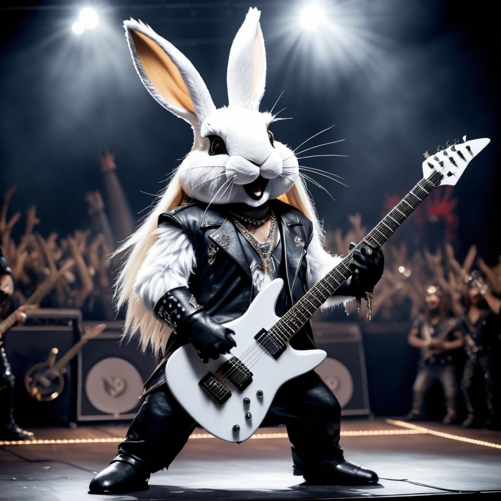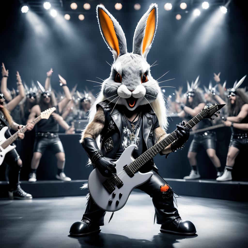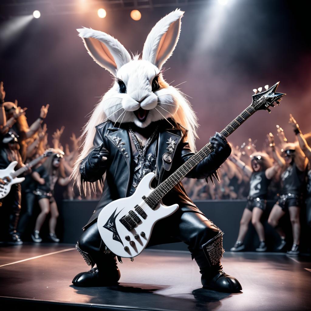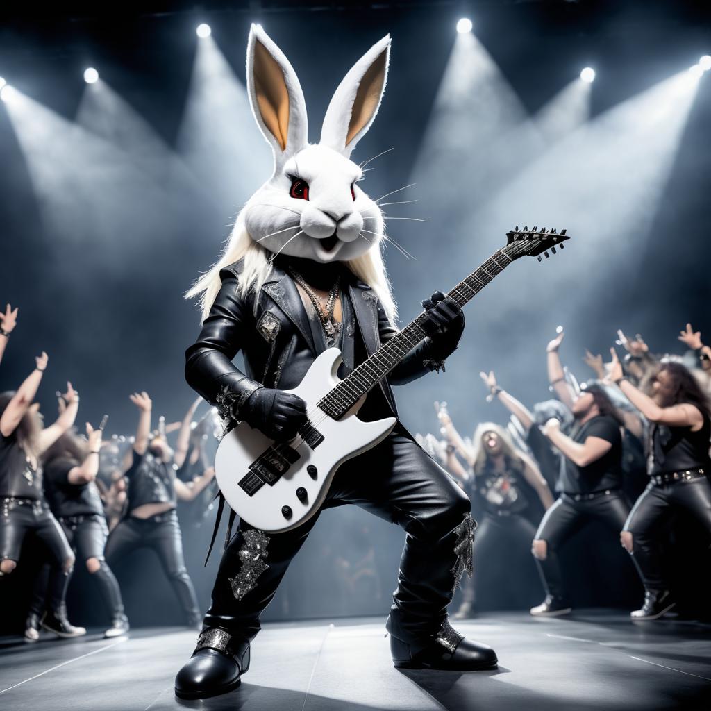 Anthropomorphic rabbit dressed as a heavy metal rock star, playing guitar on stage before a headbanging crowd, dark and photorealistic.