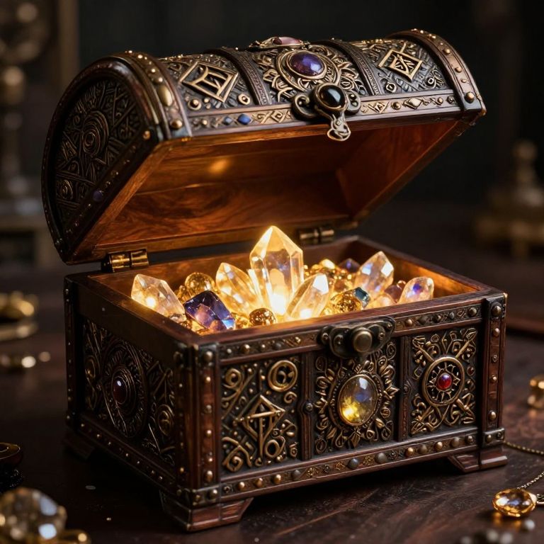 The image showcases a highly detailed and intricately designed treasure chest, exuding an aura of wealth and mystique. The chest, framed within the composition, is adorned with ornate carvings and embellishments, featuring a mix of metallic and wooden textures. The lid is open, revealing a glowing interior filled with shimmering crystals and precious stones, casting a warm, golden light that illuminates the surrounding area. The chest's surface is richly decorated with various symbols and motifs, including intricate patterns and gemstone inlays, adding to its fantastical appeal. The spatial arrangement of the chest, with its open lid and glowing contents, draws the viewer's eye inward, inviting exploration of the treasures within. The overall composition, with its dramatic lighting and detailed craftsmanship, creates a sense of wonder and anticipation, as if the chest holds untold riches and secrets waiting to be discovered.