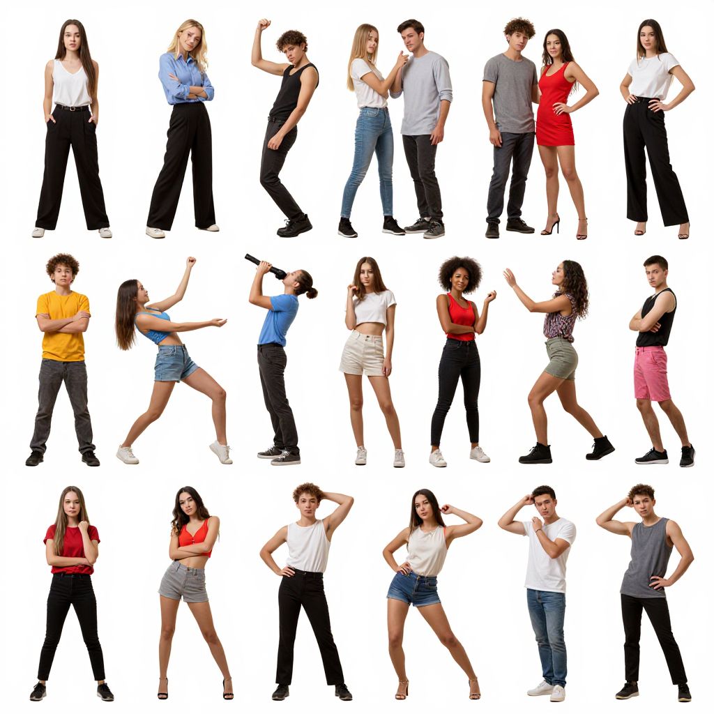 Pose reference database presenting a wide range of human figures in creative and complex stances, varying emotions and movement, photorealistic style, vibrant lighting, high contrast to emphasize form.