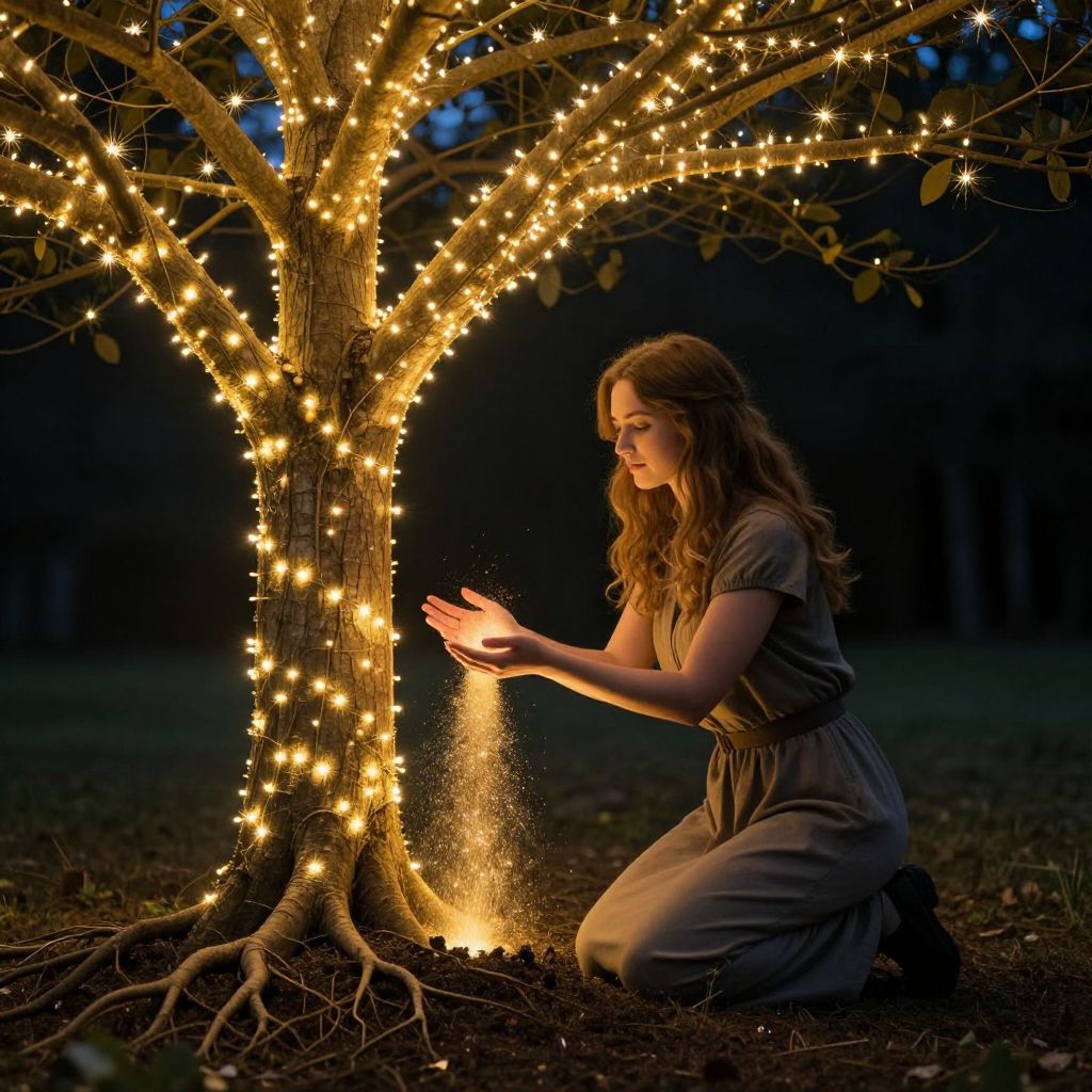 A woman kneels beside a glowing tree, its branches adorned with sparkling lights, as she gently cradles a beam of golden stardust emanating from the soil where the tree's roots emerge.