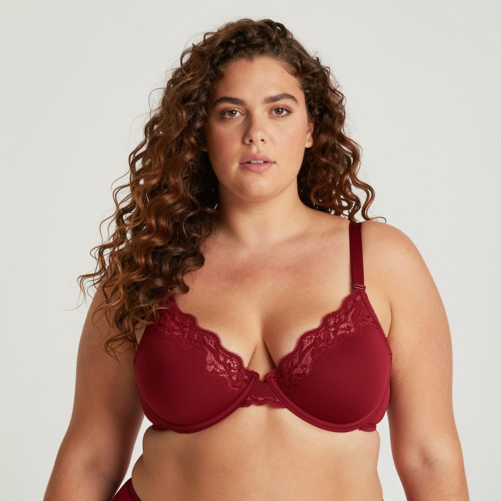 Portrait of a plus-size woman with long curly brown hair and medium brown skin wearing a red lace-trimmed bra. She stands against a plain white background with a neutral expression and slightly parted lips. The bra features underwire and scalloped lace detailing, highlighting her full breasts.