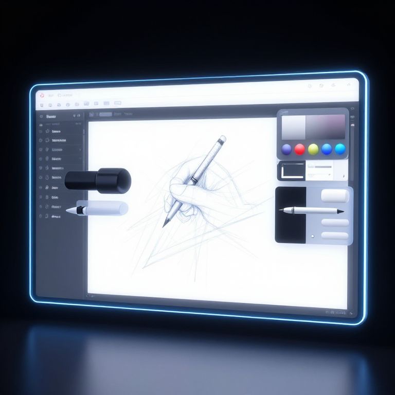 Futuristic online sketch maker dashboard glowing with neon outlines, various drawing tools like pens, erasers, and colors floating around, minimalistic user interface, high-tech digital design environment, creative digital art creation