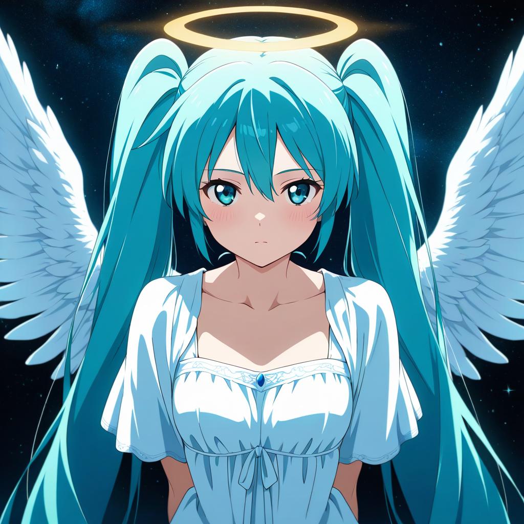 Anime coloring, anime screencap, 1girl, hatsune miku, white gown, angel, angel wings, golden halo, dark background, upper body, (closed mouth:1.2), looking at viewer, arms behind back, blue theme, cloud