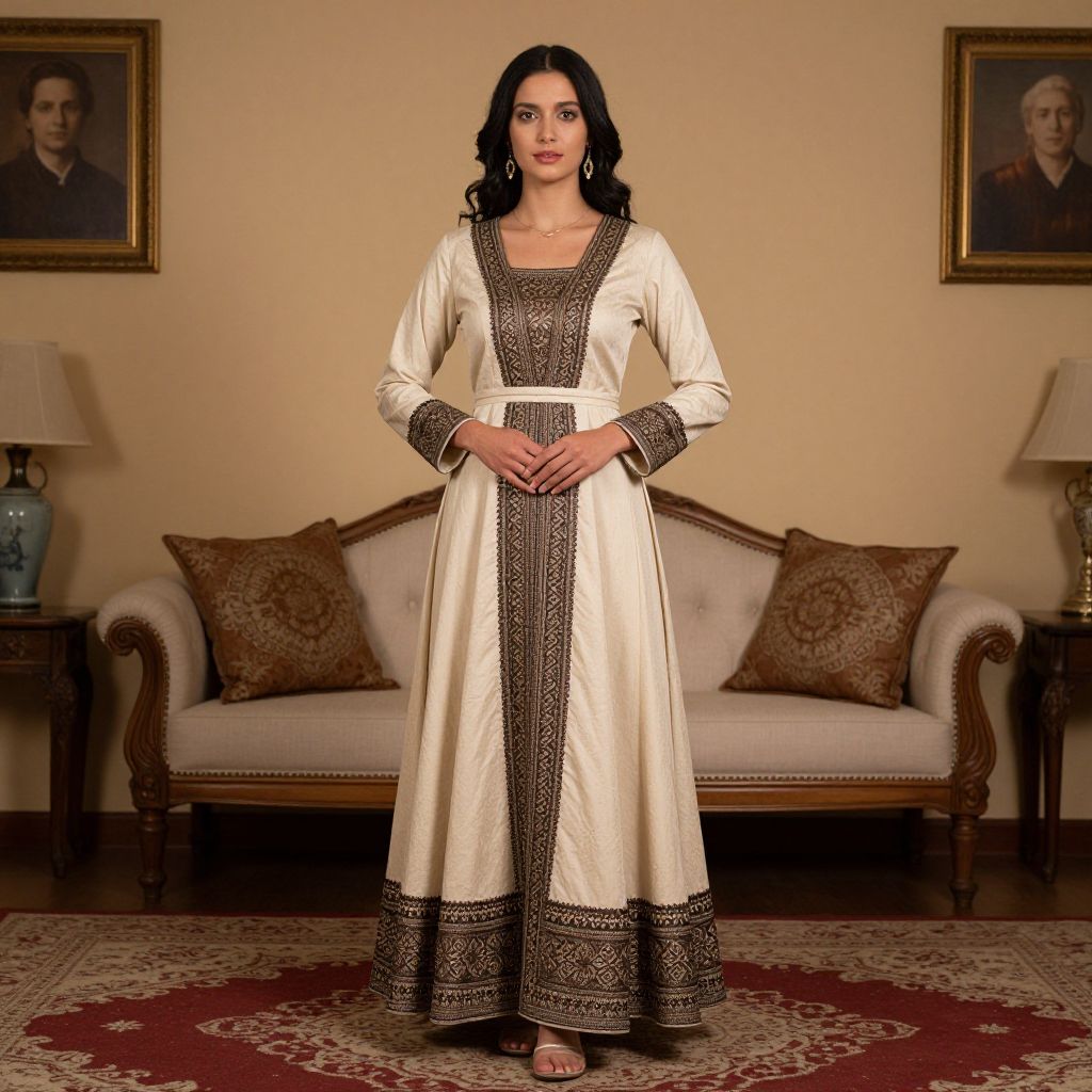 Photograph of a woman with long black hair, wearing a cream and brown embroidered traditional long dress, standing in a warmly lit living room with framed portraits